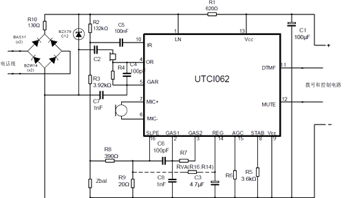 UTC1062是一塊雙極型線性集成電路。它實現全電子電話機所需的全部通話和線路接口功能,在發號和通話之間實現電子轉換。該電路能工作在低至1.6V直流線路電壓(性能將有所降低),以便更多的話機并聯使用。